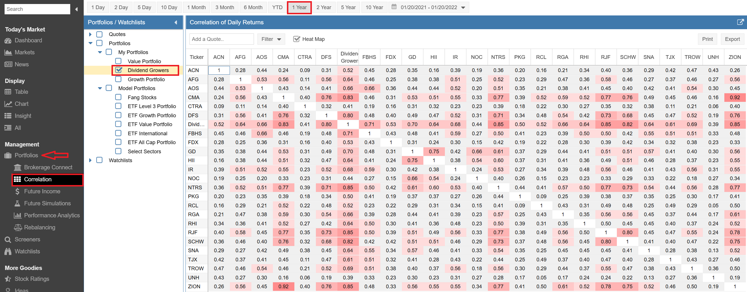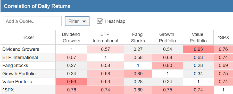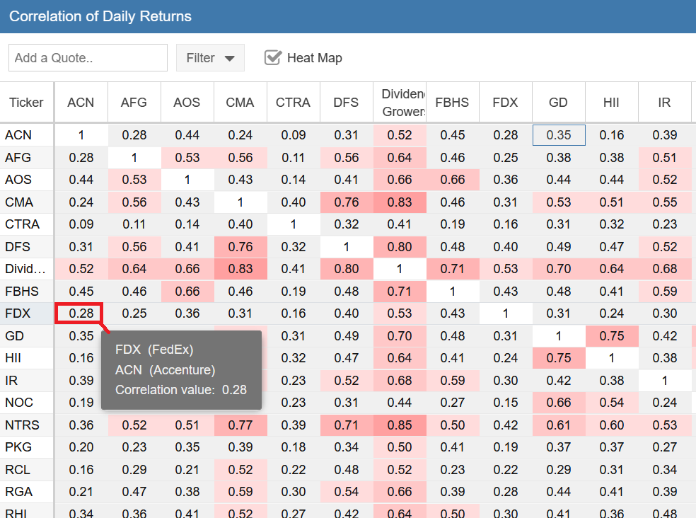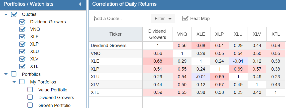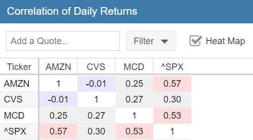 Another good article with very valuable information. I do have a couple of ideas on how to expand the information and want to see if they make sense and are worth considering. Looking at correlation on its own would seem to give a good but not complete indicator. Given the statement “If two assets have a correlation value of 1, this means that they have perfect positive correlation—they move in the same direction (in the same proportion) 100% of the time” implies that a correlation could be impacted by either difference in volatility ( ie moving the same way but by different proportions), or by moving in the opposite direction. Charting 2 stocks can show which is the bigger factor, but that takes some time. One factor that could add to the understanding could be the Ratio data. I love the ratio chart, and had a spreadsheet doing this before starting Stockrover. That chart shows whether the investments go up or down together or trend consistently in one direction, eg Investment A is growing faster than B. My use of the ratio chart has been to help understand the overall trend (is A generally growing faster over time than B), and is it a good time to move from A to B. If Ratio A/B is high (above the trend), then you will acquire more of Stock B than you will if the ratio is low (below the average). 2 views would, I believe, help look at the information on a larger scale than the charting option – The first is a Ratio table, in exactly the format of the Correlation table, showing the ratio between each pair for a selected date. We would be able to look at the ratios on multiple dates. The second is a Trend table, again in the same format of the Correlation table, with the regression trend between 2 dates. For example, A = mB + n over the past 5 years, indicates that A has grown faster by a factor of m. I realize this is may be a personal way of thinking, but feel the extension of the Correlation table with these 2 views could be relatively easy and valuable in identifying where to look in more detail. Interested in any comments, even if it makes no sense!