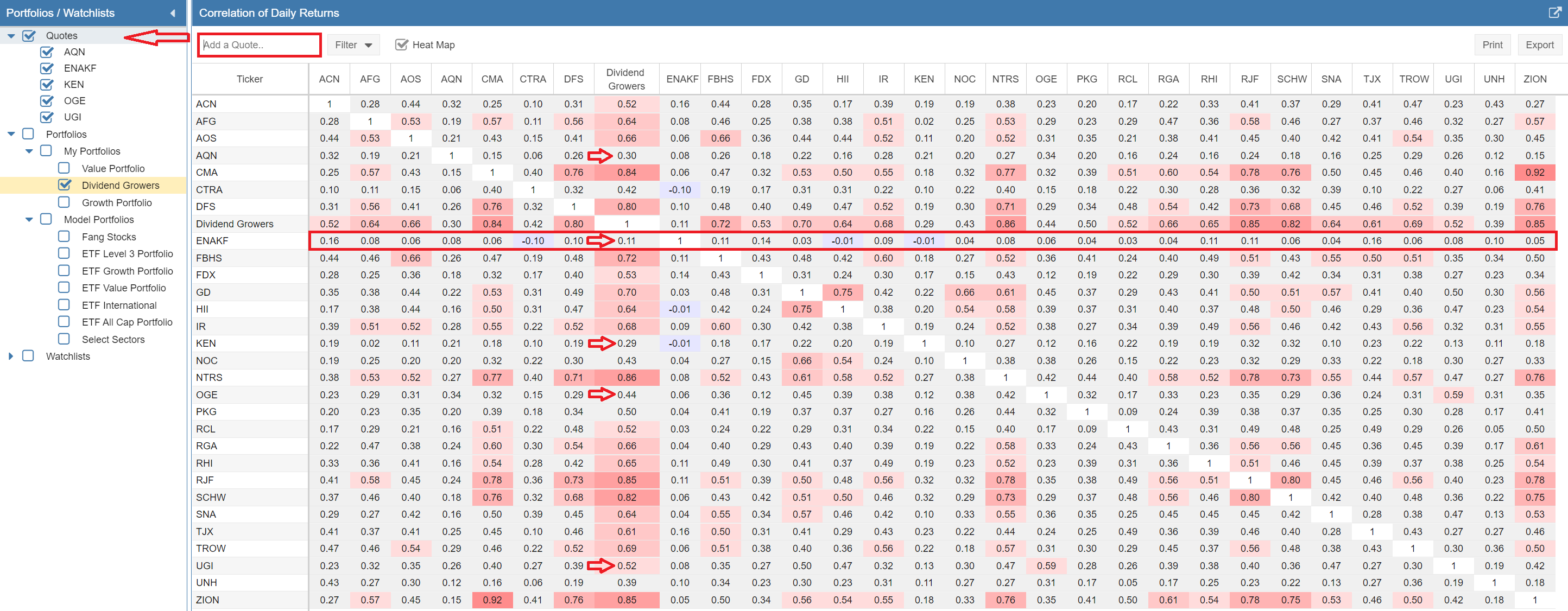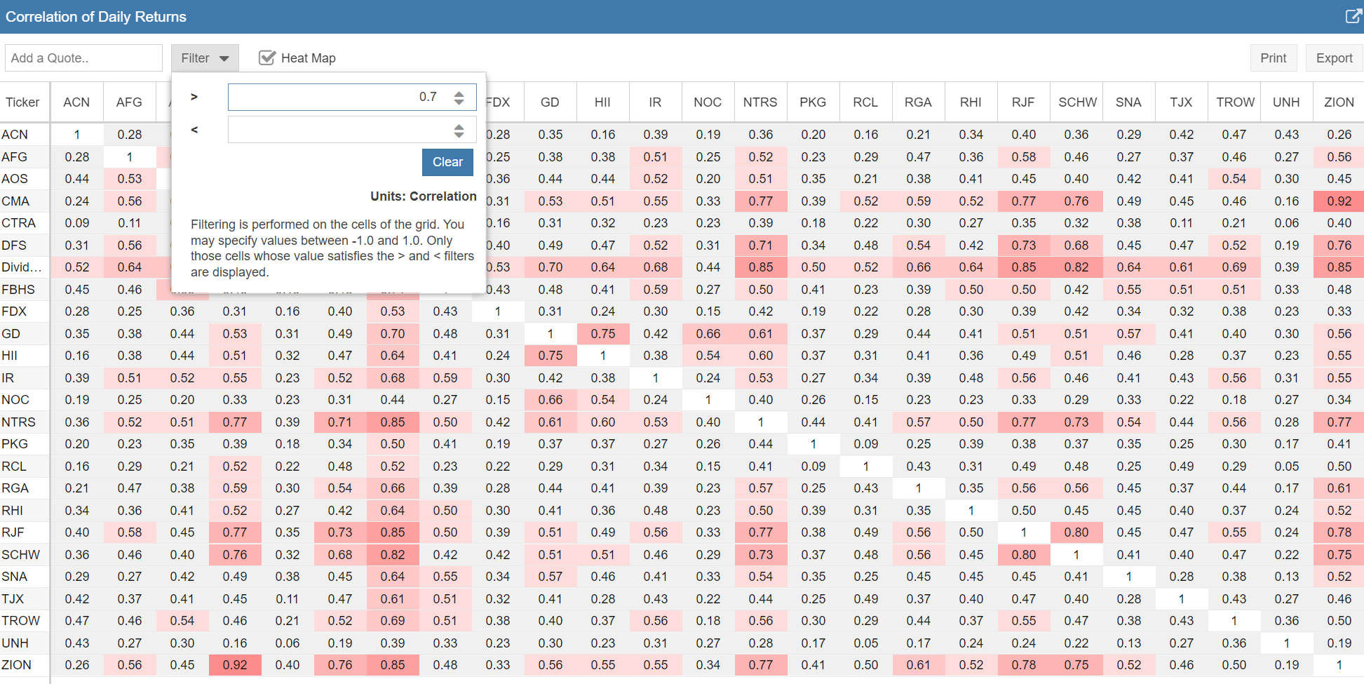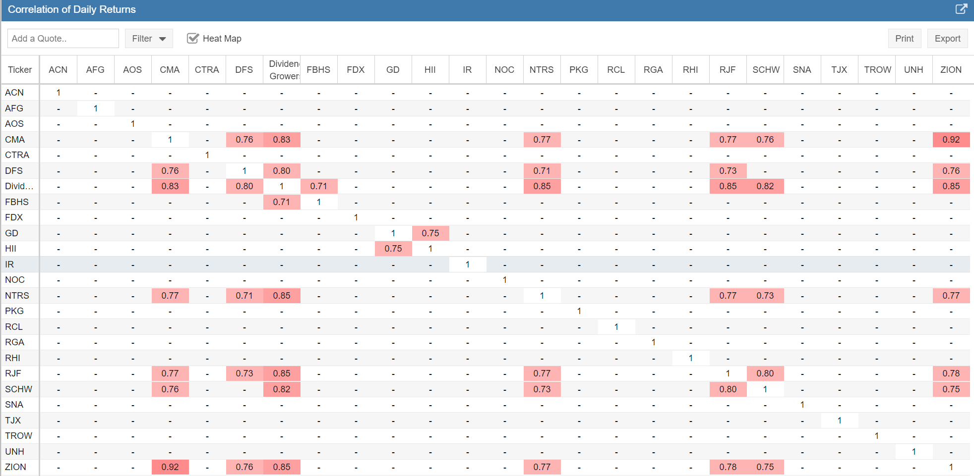 Another good article with very valuable information. I do have a couple of ideas on how to expand the information and want to see if they make sense and are worth considering. Looking at correlation on its own would seem to give a good but not complete indicator. Given the statement “If two assets have a correlation value of 1, this means that they have perfect positive correlation—they move in the same direction (in the same proportion) 100% of the time” implies that a correlation could be impacted by either difference in volatility ( ie moving the same way but by different proportions), or by moving in the opposite direction. Charting 2 stocks can show which is the bigger factor, but that takes some time. One factor that could add to the understanding could be the Ratio data. I love the ratio chart, and had a spreadsheet doing this before starting Stockrover. That chart shows whether the investments go up or down together or trend consistently in one direction, eg Investment A is growing faster than B. My use of the ratio chart has been to help understand the overall trend (is A generally growing faster over time than B), and is it a good time to move from A to B. If Ratio A/B is high (above the trend), then you will acquire more of Stock B than you will if the ratio is low (below the average). 2 views would, I believe, help look at the information on a larger scale than the charting option – The first is a Ratio table, in exactly the format of the Correlation table, showing the ratio between each pair for a selected date. We would be able to look at the ratios on multiple dates. The second is a Trend table, again in the same format of the Correlation table, with the regression trend between 2 dates. For example, A = mB + n over the past 5 years, indicates that A has grown faster by a factor of m. I realize this is may be a personal way of thinking, but feel the extension of the Correlation table with these 2 views could be relatively easy and valuable in identifying where to look in more detail. Interested in any comments, even if it makes no sense!
