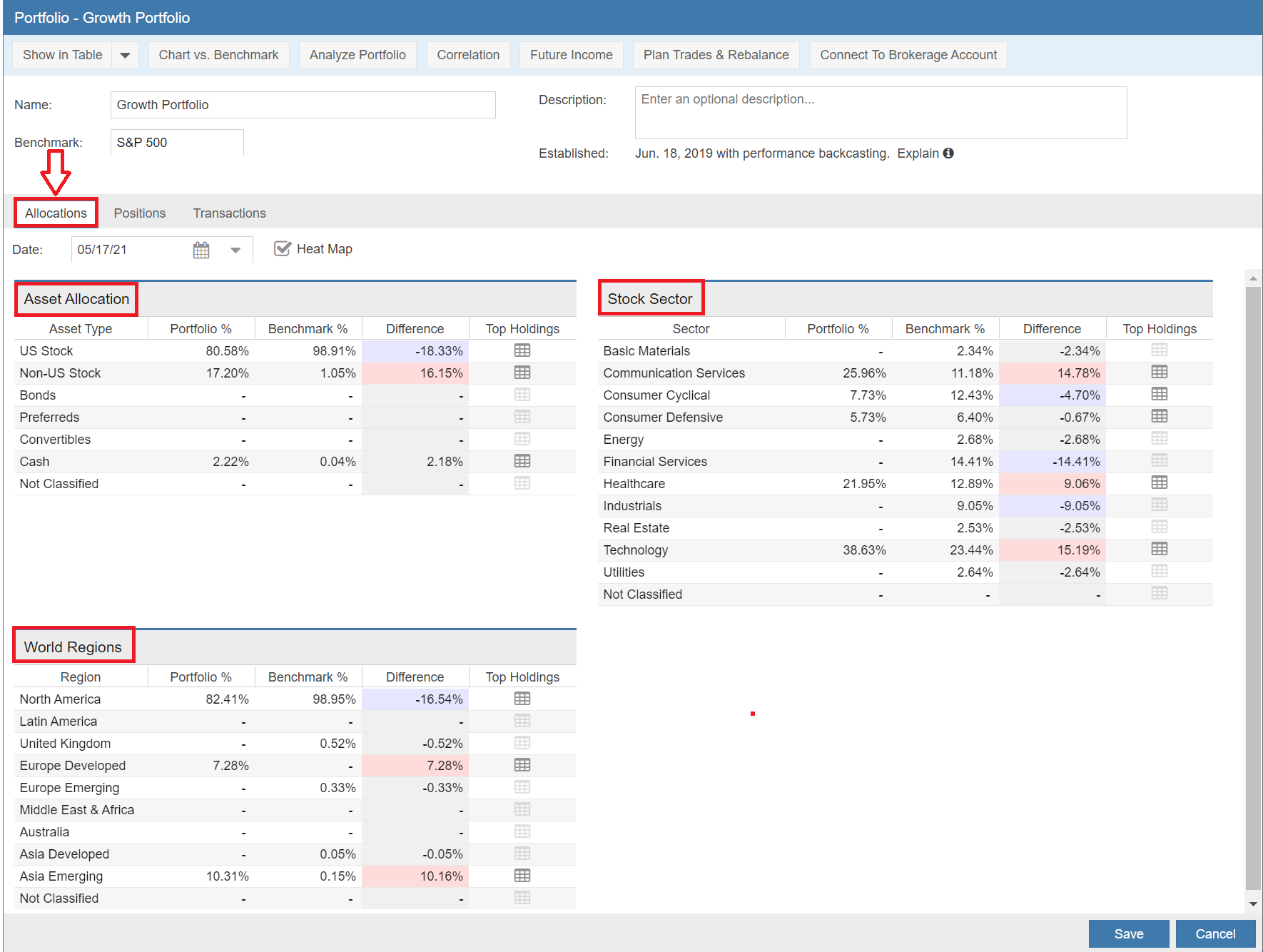 One important update relates to ETF’s. If you own ETF’s, the ETF holdings are broken out and factored into their proper categories. So for example, if you only owned SPY (the S&P 500), you would still get a breakout of the SPY ETF in all three allocation tables: Assets, Sectors and Regions.