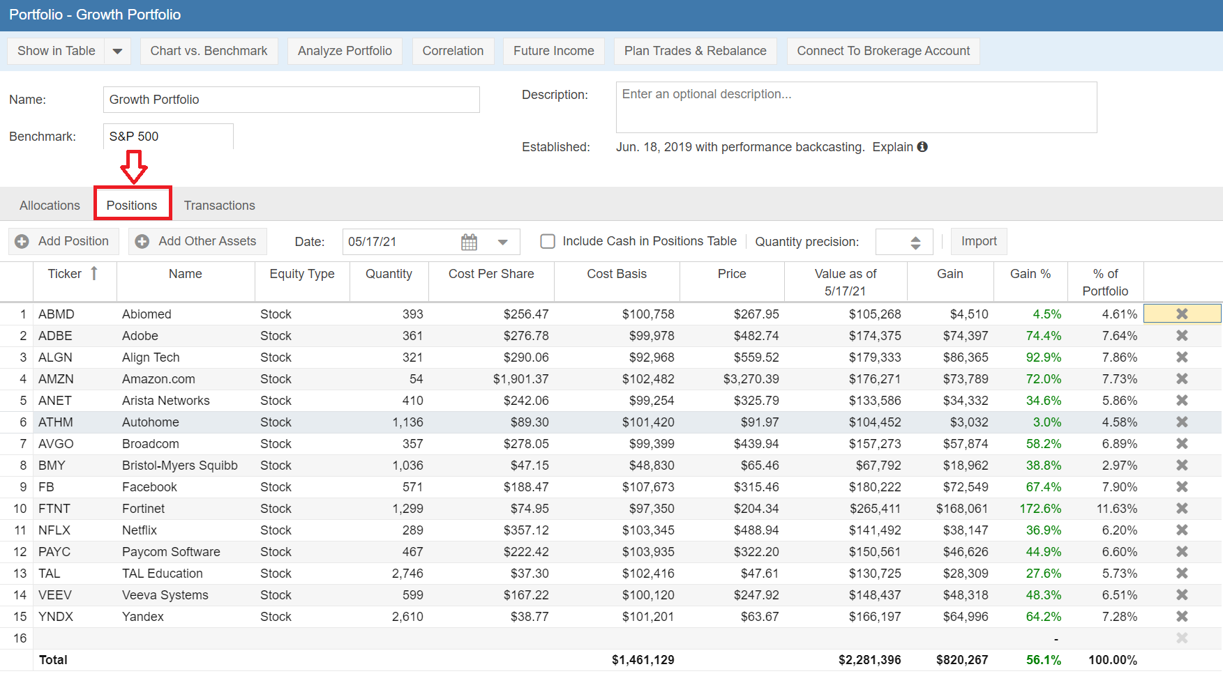 Stock Rover also has simplified Portfolio Management. There are now two views of a portfolio you can switch between: Position View and Transaction View. Position view is shown below.