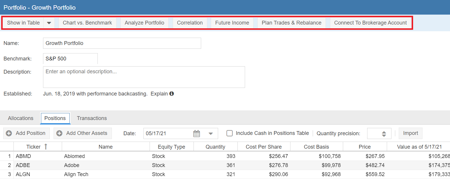 The top row of buttons gives you access to common portfolio actions, as shown in the screenshot below.