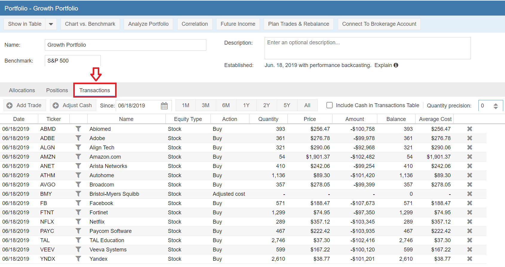Note that the position-based system means there is a limitation in that day-trading transactions cannot be entered and maintained. In Stock Rover the net result of a day trade where there is no change to a position at the the end of the day is just a change in cash that reflects the gain or loss on the trades(s).