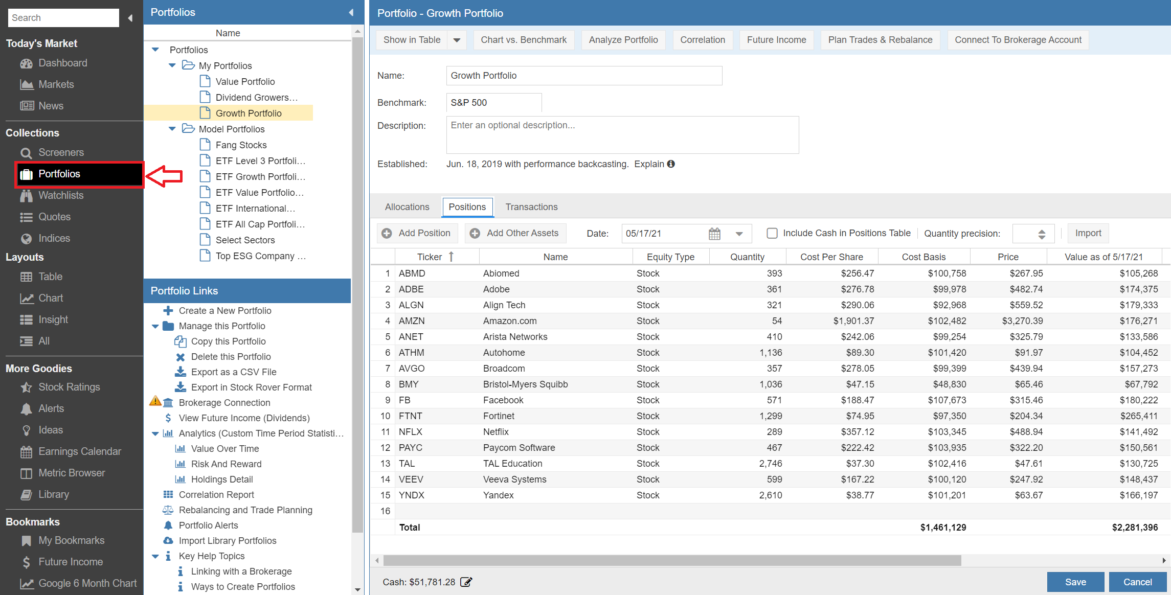 Again similar to screeners, the Portfolio Management window has three sections. The upper left contains the current list of portfolios; the lower left contains a structured list of quick links for various portfolio functions; and the main window on the right is loaded with the details of the selected portfolio.