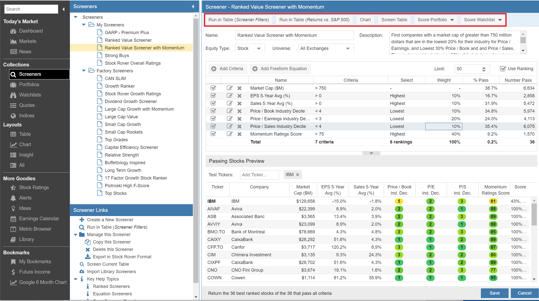 There are a few new cool things in the Screener Management window. First, Stock Rover can now show the results of the screener in the table with a dynamically created view called ‘Screener Filters’ that automatically includes each screener filter as a column in the Table. This is a powerful feature that lets you see and manipulate the results of a screener in the table with the screener criteria as columns.