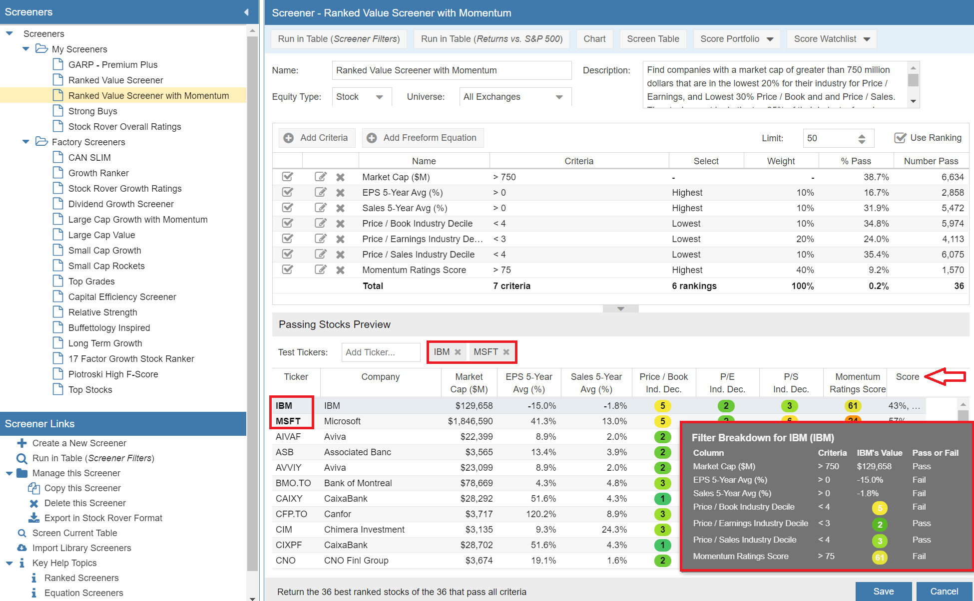 The passing stocks preview window has been updated. You can now test multiple tickers of your choosing against the screener. The screenshot below shows testing against IBM and Microsoft.