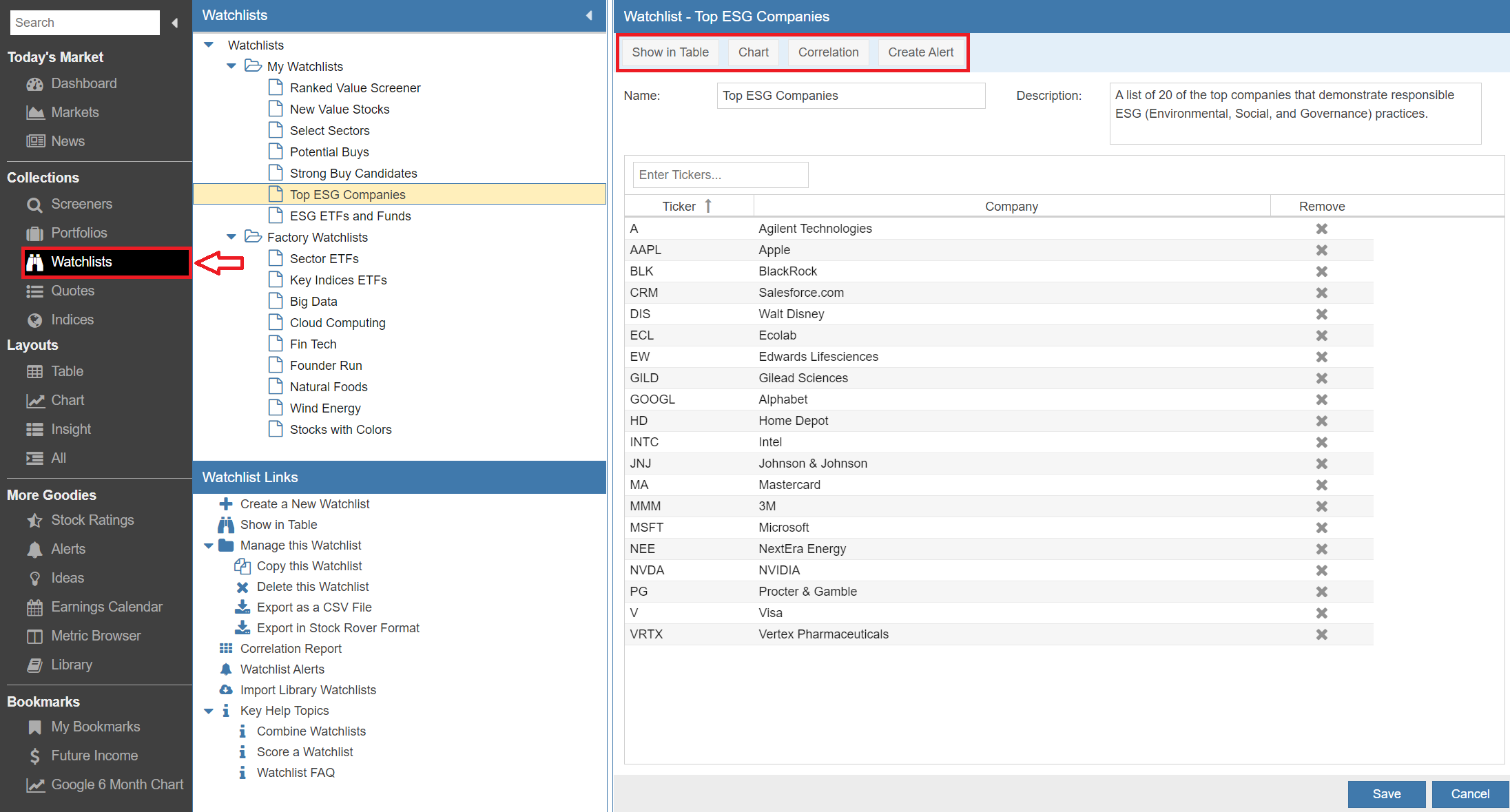 The Watchlist Management window follows the same conventions as the Screener and Portfolio Management windows, except the functions are watchlist specific.