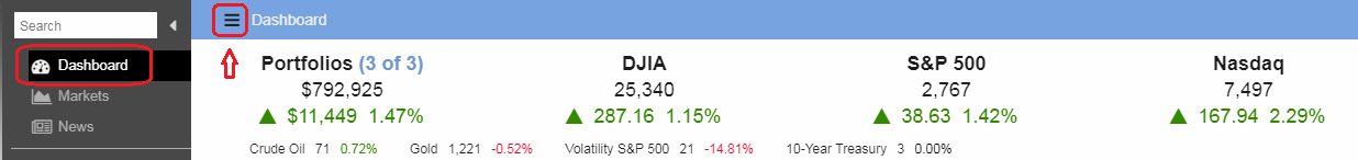 The first section in the Dashboard is the Markets Summary section, showing you how your portfolios and how the markets are performing on the current trading day. This gives you a quick idea of what the markets are doing and whether your portfolios are outperforming or underperforming the market. You can configure which of your portfolios you want to include in the dashboard via the little hamburger icon next to the Dashboard header as shown via the arrow in the image below.