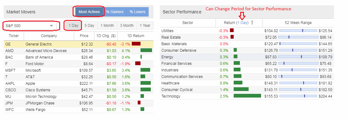 With Market Movers you can focus on whatever index you like, the time period, and whether to focus on most actives, gainers or losers. You can also sort table in different ways by clicking on the column headers.