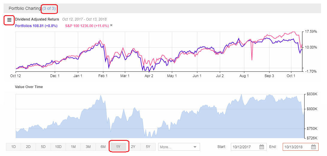 Portfolio Charting is the third section of the Dashboard. The first part of the chart is a great way to visually see the performance of your portfolio both on an absolute basis, and vs. key benchmarks such as the S&P 500. The second chart shows the value of your portfolios over time. Mousing over the charts provides additional information. Periods are easily selectable and customizable, and can range from one day to ten years. You can change the portfolios included and the benchmarks used, as well as the date range. All are highlighted on the screenshot below.