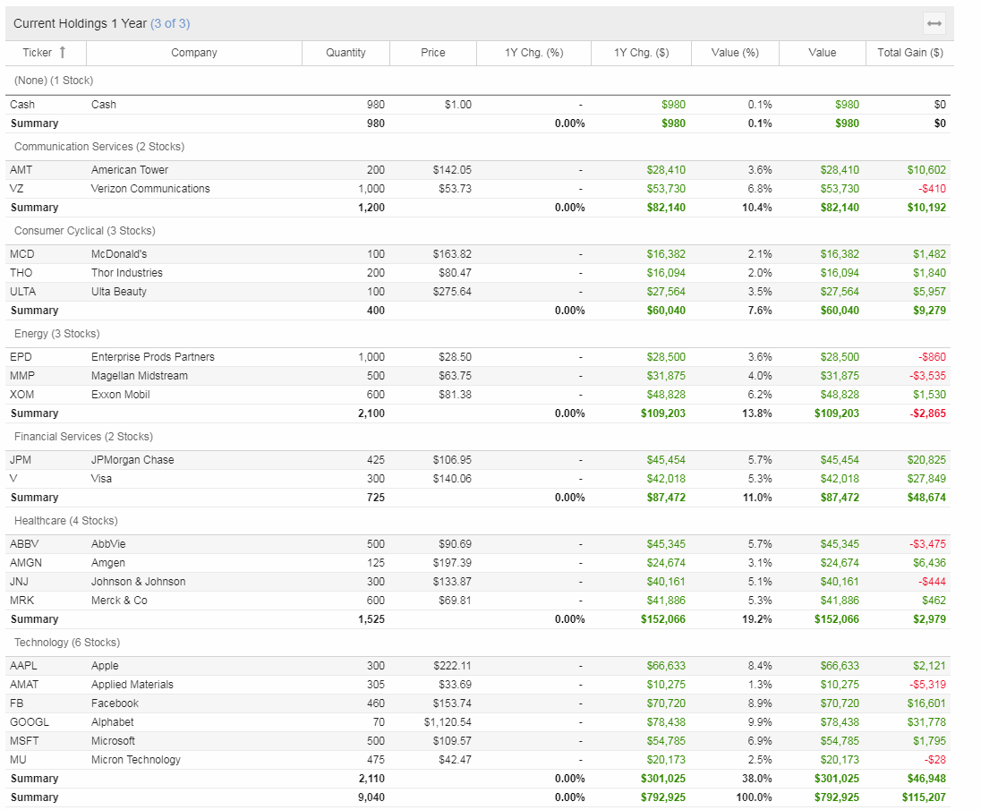 The next two sections show you in tabular form the performance of each portfolio in the selected time period. The first table display performance at the portfolio level and the second table show performance at the position level, aggregated across portfolios.