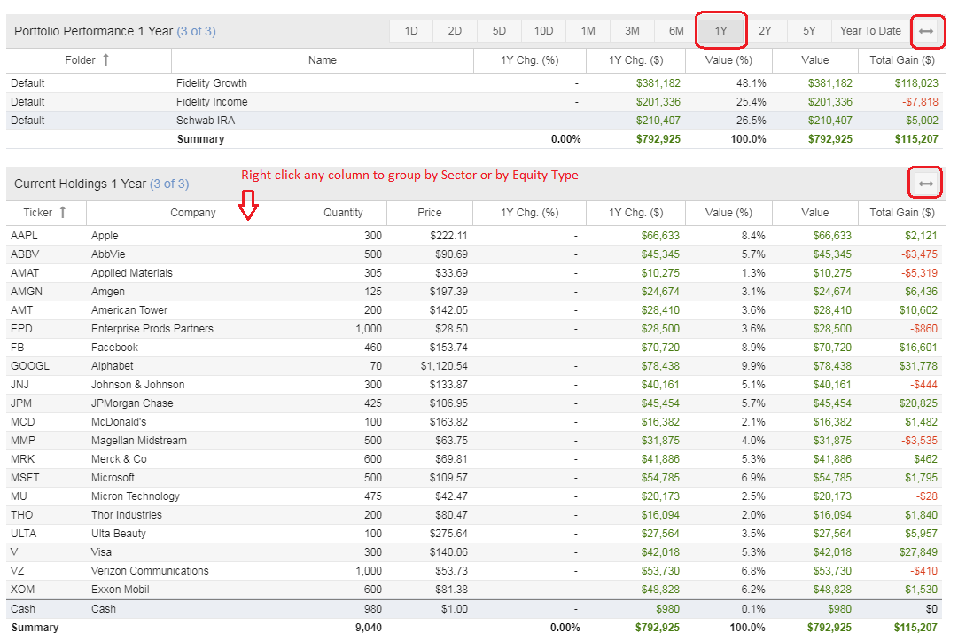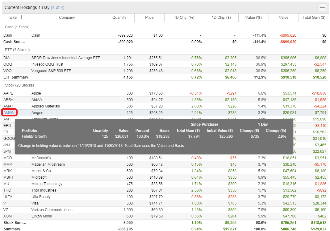 There is a powerful tooltip available if you mouse over a position. The tooltip will show you your overall gain since purchase, calculated from your cost basis. The tooltip will also show your gain in the selected reporting period, which you can control. If a position is held in multiple portfolios, each portfolio position is listed separately. The screenshot below shows an example of this.