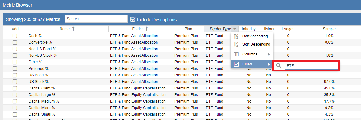 If you right-click on a column, there will be a filter option that can be selected, as seen in the example below. In this example, ETF is listed in the text field, and it will filter and display metrics that can be used with ETF-type tickers.