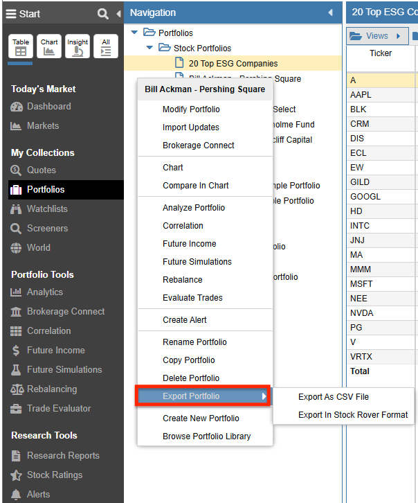 Portfolios can be exported to a .csv file for subsequent import into a spreadsheet program. They can also be exported as a .txt file in Stock Rover Format for future import back into Stock Rover. The .txt file can be shared with other Stock Rover users or used as a backup copy.