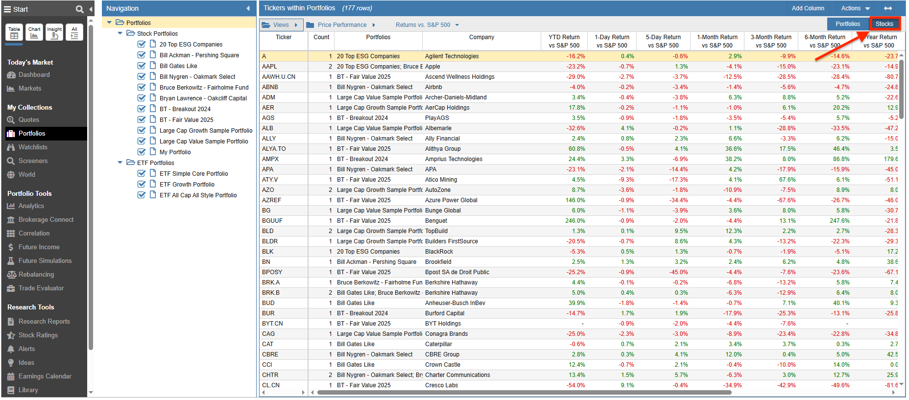 You can also show all the tickers in the Table for all the chosen portfolios by selecting the Stocks button in the Table.