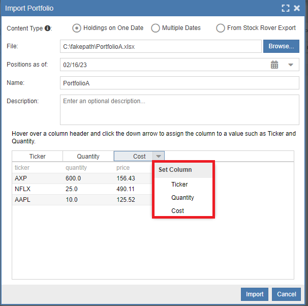 Another option with importing portfolios is importing the history of the portfolio. This option can be done with changing the Content Type and selecting, “Multiple Dates” or “From Stock Rover Export”.