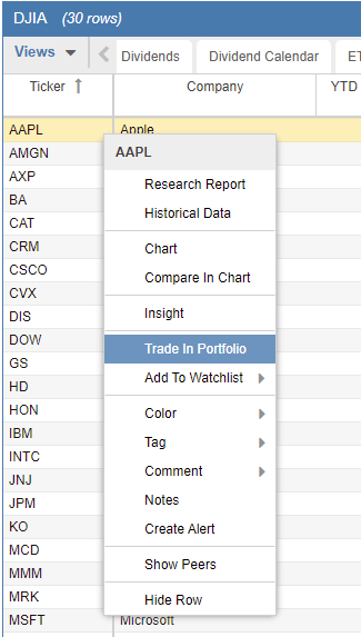 You can also enter a trade into your portfolio directly from the Table. To do so, right-click a stock in the Table and select ‘Trade in Portfolio’ from the drop-down menu.