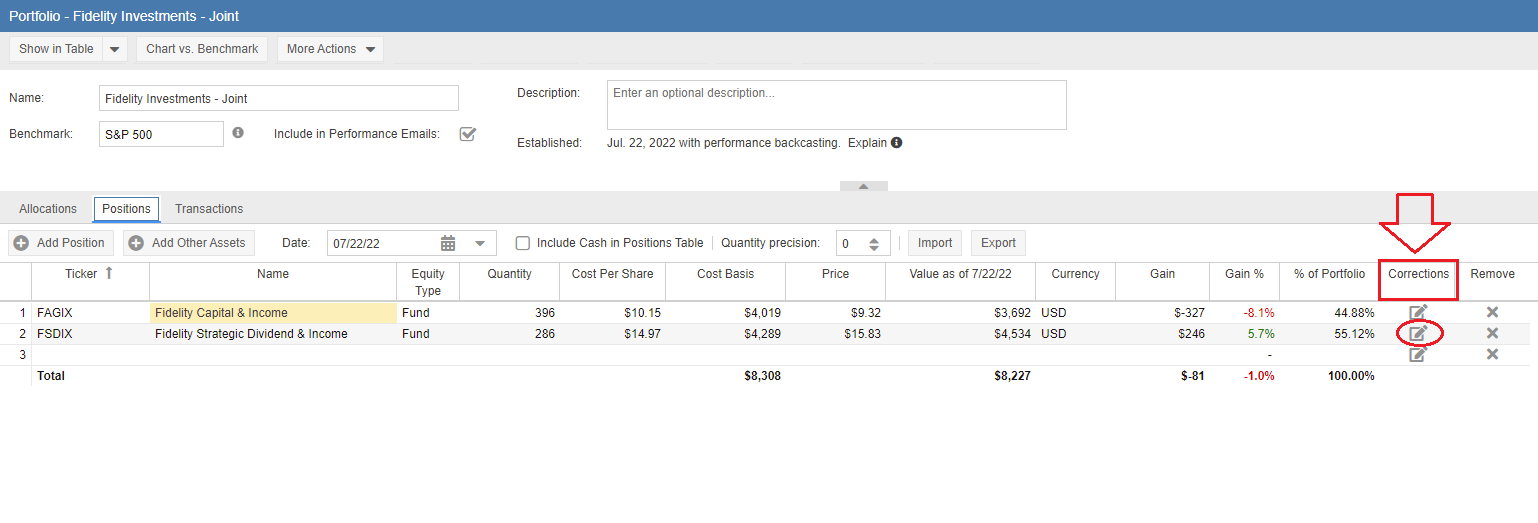 Start by selecting your portfolio from Portfolio Manager and then going to the Positions tab. Then highlight the ticker and scroll to the right to the ‘Corrections’ column. Then click the edit button for this ticker as highlighted in the screenshot below.