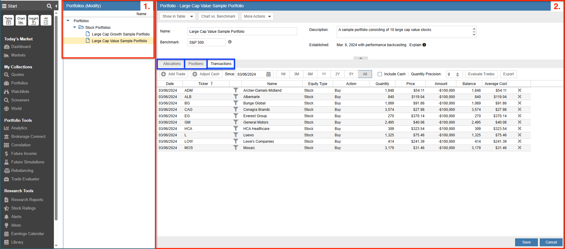 Portfolio Manager functions include the ability to view and modify a portfolio’s positions or, if we prefer, view and modify the underlying buy and sell transactions.