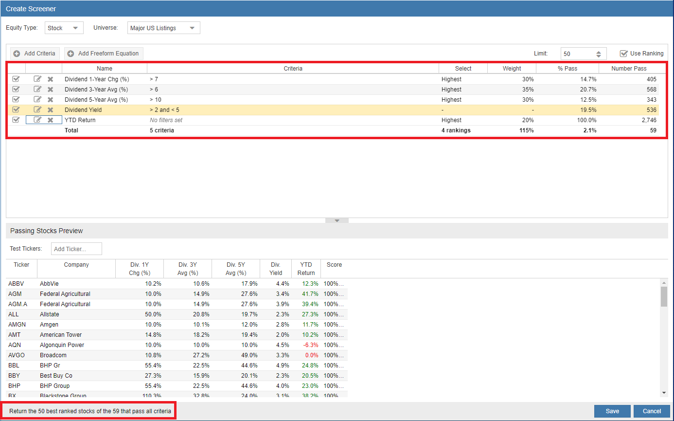 With the ranking feature activated, you can add filter criteria without using the weighting (as you can see below with the Dividend Yield criterion), you can weight a metric without adding filter values (as you can see below with YTD Return criterion), or you can assign both a weight and filter values for a metric (as you can see below with the Dividend 1- and 3-year changes). Note below the box you can see the number of stocks that pass your screener, as well as the number that will be returned as specified in the limit, in addition to a preview of the list of tickers that pass your criteria.