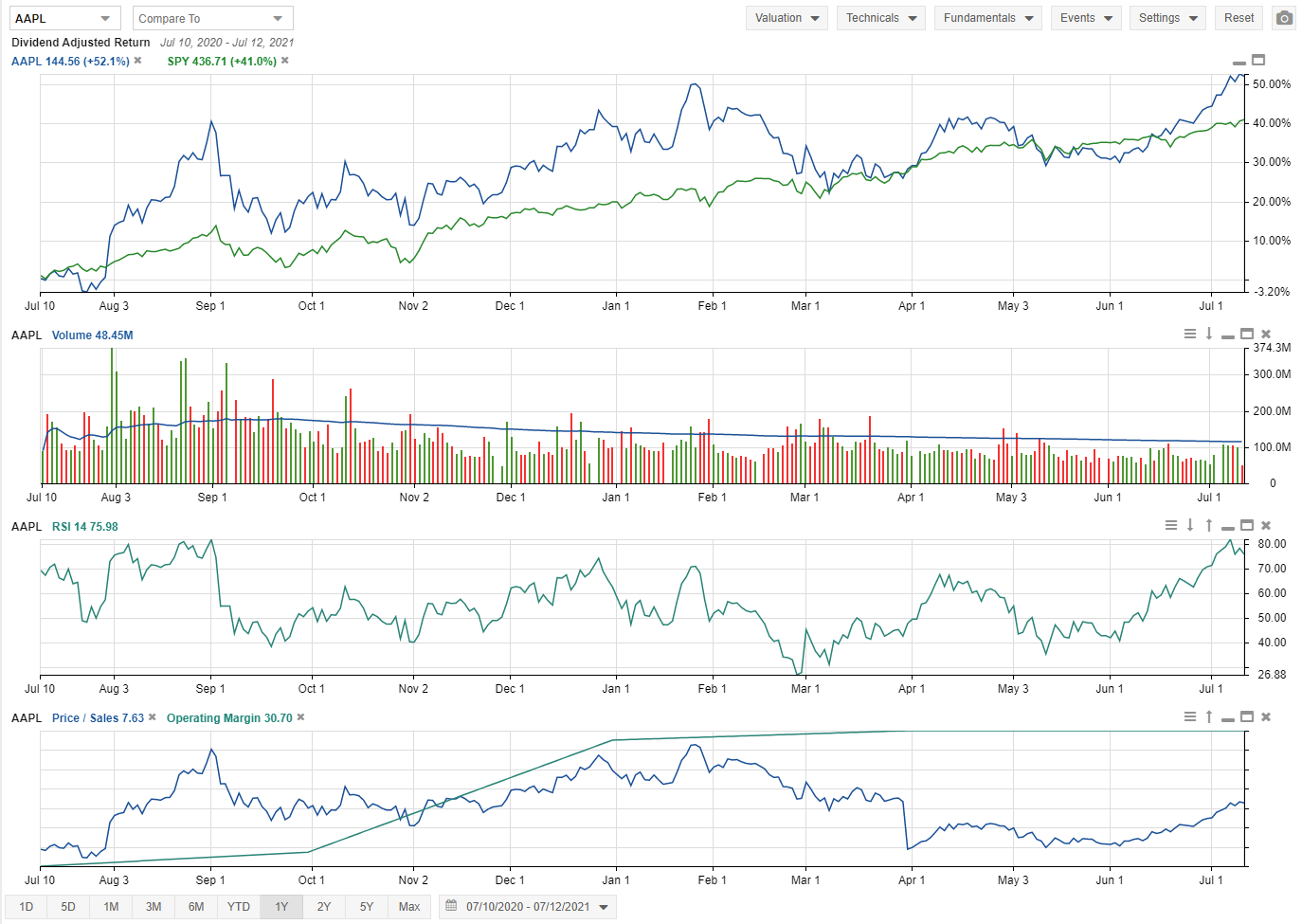 Stock Rover has powerful charting capabilities. You can chart price, chart over 100 fundamentals, and chart key technical indicators. You can baseline stocks too for easy relative performance comparison. You can chart macro entities such as screeners, portfolios, and watchlists. Charts can be displayed by price, percentage, logarithmic, or candlesticks. Charts can include or exclude dividends. Events can be added to charts, such as buy/sells, dividends, splits, earnings events, and max drawdowns. You can export charts as images to take with you. The full capabilities of charting are described in the following sections.
