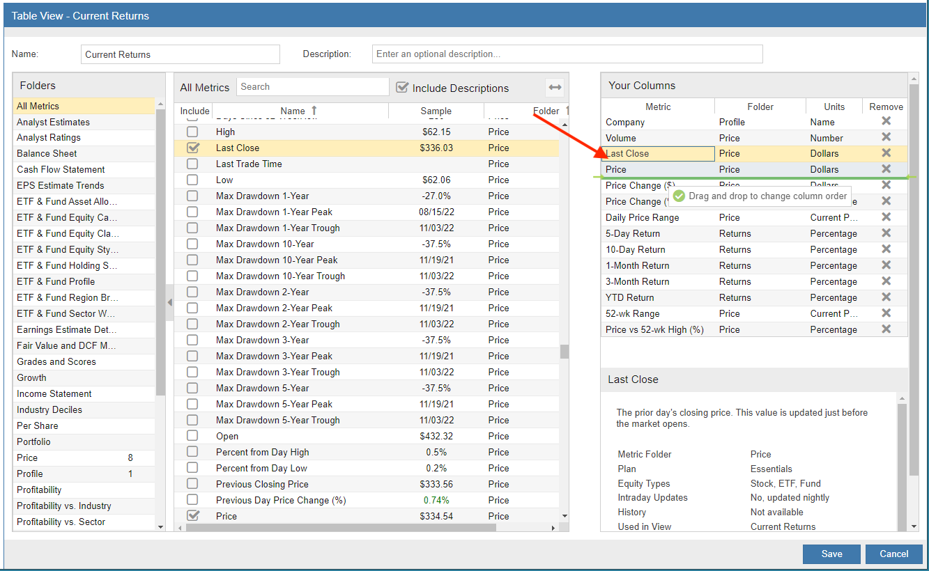 With a Premium Plus subscription you can create custom columns. Custom columns are created by creating an associated custom metric that is displayed as a column. A custom metric is a unique formula created by you that allows you to create your own financial metrics and have them integrated into Stock Rover as if they were built into the product. Custom metric creation is easy. Custom metrics are also quite powerful as they can source current or historical data from any of the over 700 existing metrics in Stock Rover.