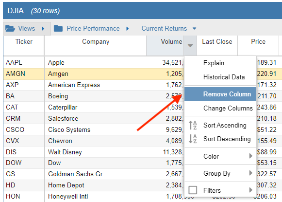 To group the stocks in the Table by color, currency, industry, sector, or tag, right-click on any column in the table and mouseover ‘Group By’ and select from the menu.