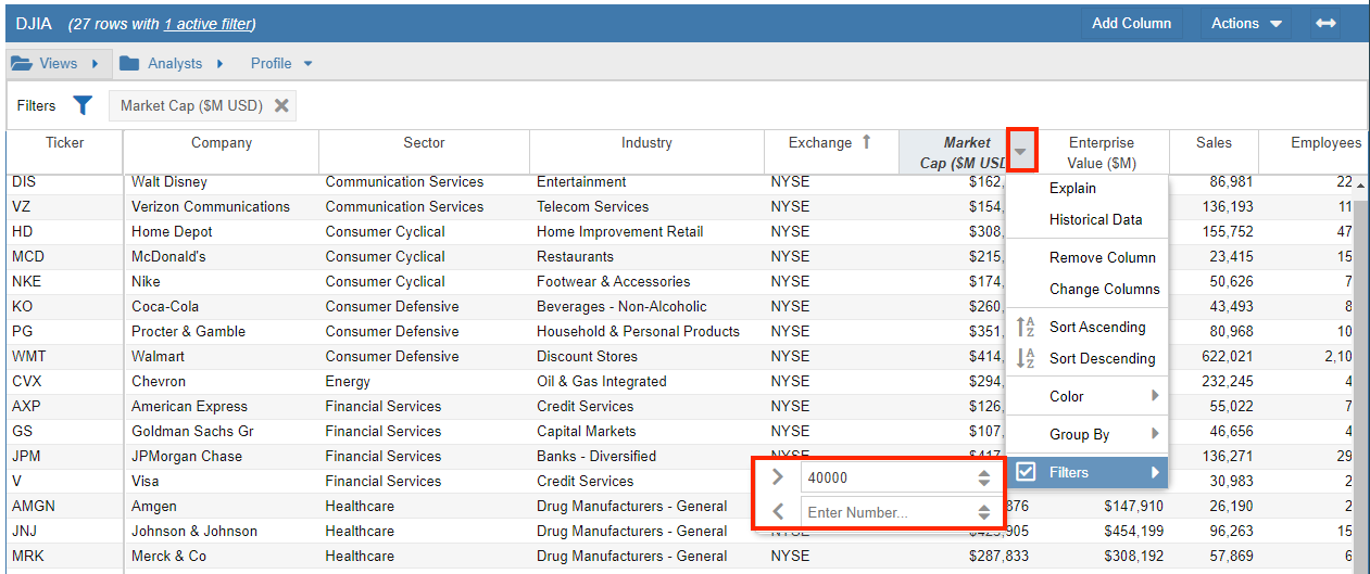 A filter will reduce the number of tickers displayed in the Table to only those that meet the filter criteria.