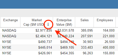 We have the ability to sort on multiple columns. This is most useful when one of the sorted columns has lots of duplicate values. For example columns that contain metrics like Exchange, Sector, Industry or Morningstar Rating are all likely to have a lot of duplicate values. In the example seen below, we clicked on the Market Cap column first to sort it, then we clicked on the Exchange column. The result is the display is sorted on the Exchange metric with the Market Cap metric sorted within each Exchange value.