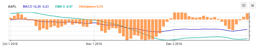 By comparing EMAs of different lengths, the MACD series gauges changes in the trend of a stock. The difference between the MACD series and its average is claimed to reveal subtle shifts in the strength and direction of a stock’s trend. A “signal-line crossover” occurs when the MACD and average lines cross; that is when the divergence (the bar graph) changes sign. The standard interpretation of such an event is a recommendation to buy if the MACD line crosses up through the average line (a “bullish” crossover), or to sell if it crosses down through the average line (a “bearish” crossover).