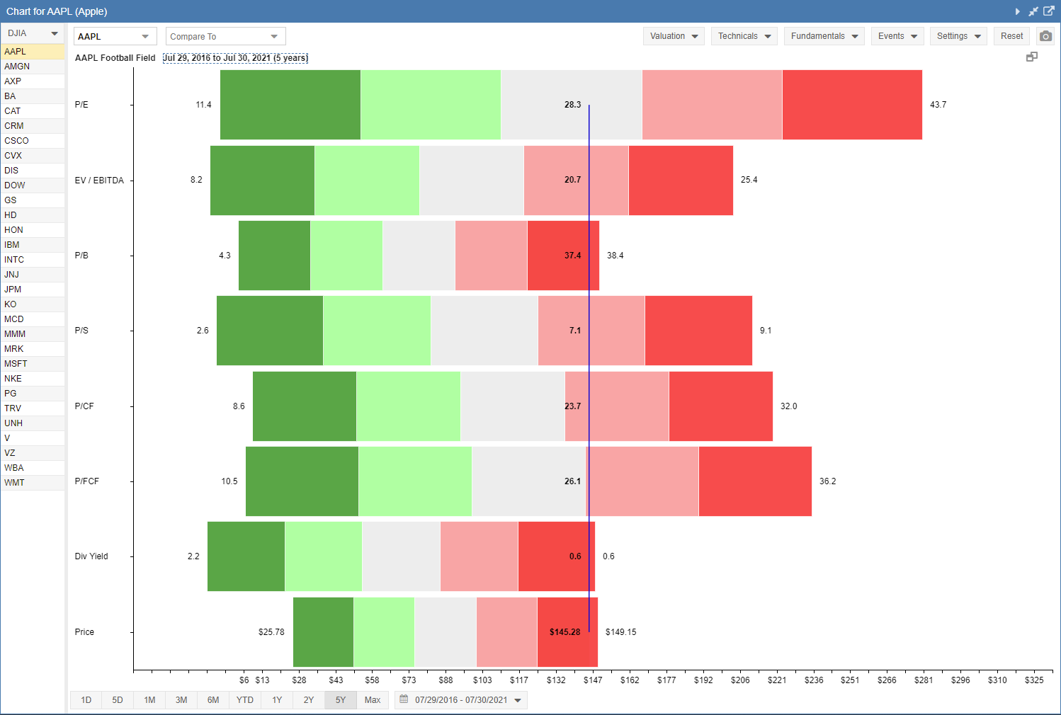The chart below shows you a powerful presentation of valuation data for Apple (AAPL) by comparing the current valuation metrics (blue vertical line) vs. its five-year range.