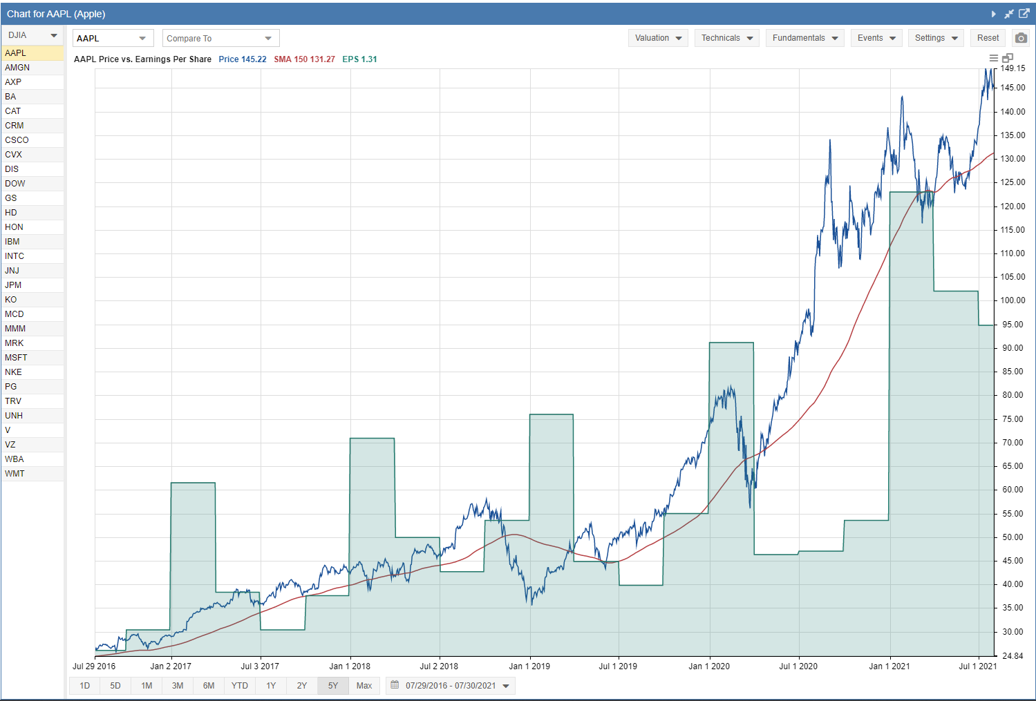 The chart below displays a line for the selected fundamental rendered in the same chart as the ticker’s price. Both of these lines begin at the same point so you can see how the fundamental value varies over time relative to the price.