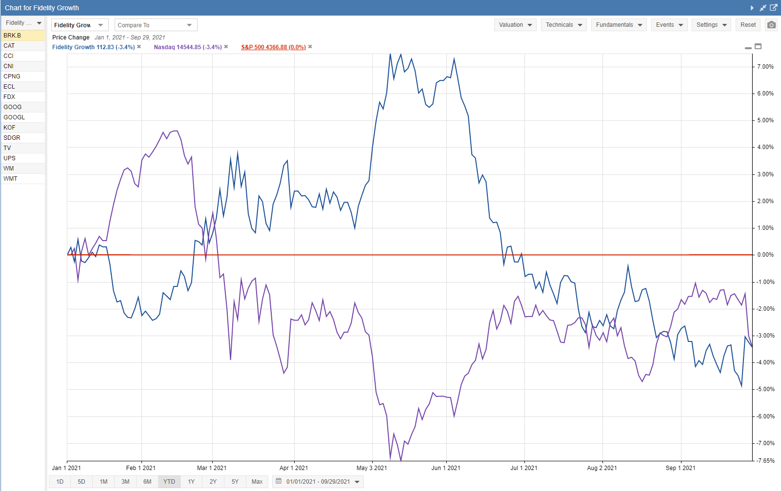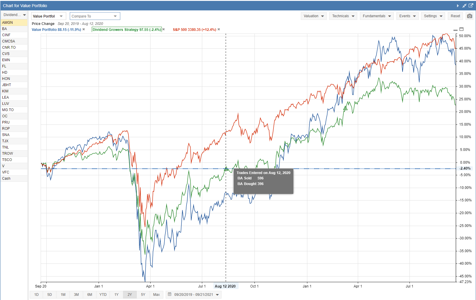 We hope your portfolio was constructed with an appropriate risk tolerance for your investment goals. While the S&P 500 is the most common benchmark it isn’t necessarily the right benchmark for your portfolio as we all have different goals at different times. Stock Rover lets you compare the total return performance (including dividends) of your portfolio against any benchmark you favor, whether that’s a popular index, ETF, or another portfolio. One-click on this index benchmark sets it as a baseline for the chart, or as the quants would say, normalizes the chart for the performance of the S&P 500: