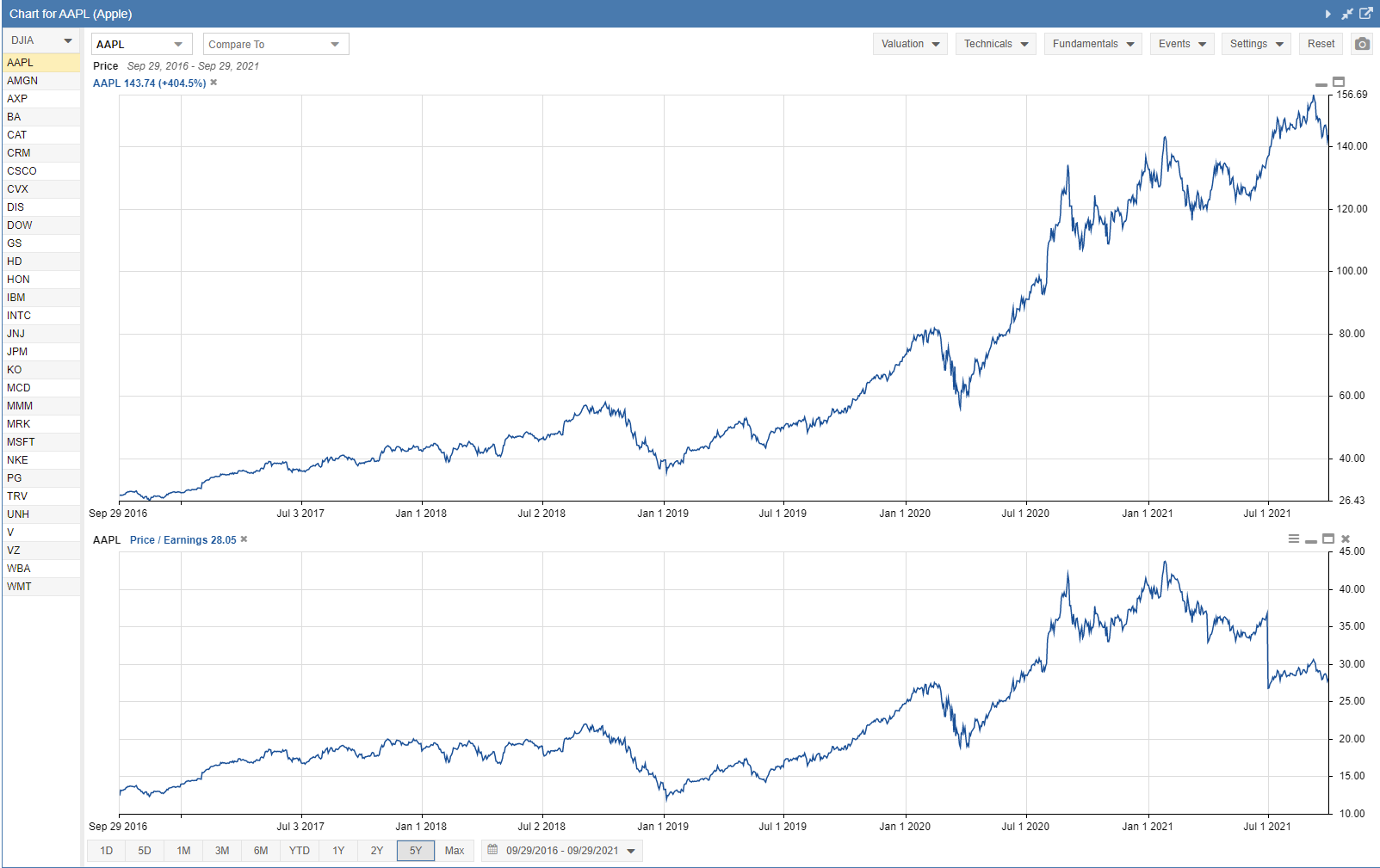 The Price / Earnings ratio is just one of 100+ financial metrics that can be charted. You can chart fundamental metrics against each other or compare the same metric for multiple companies. This is extremely useful for pair trading and comparing a company to its peers.
