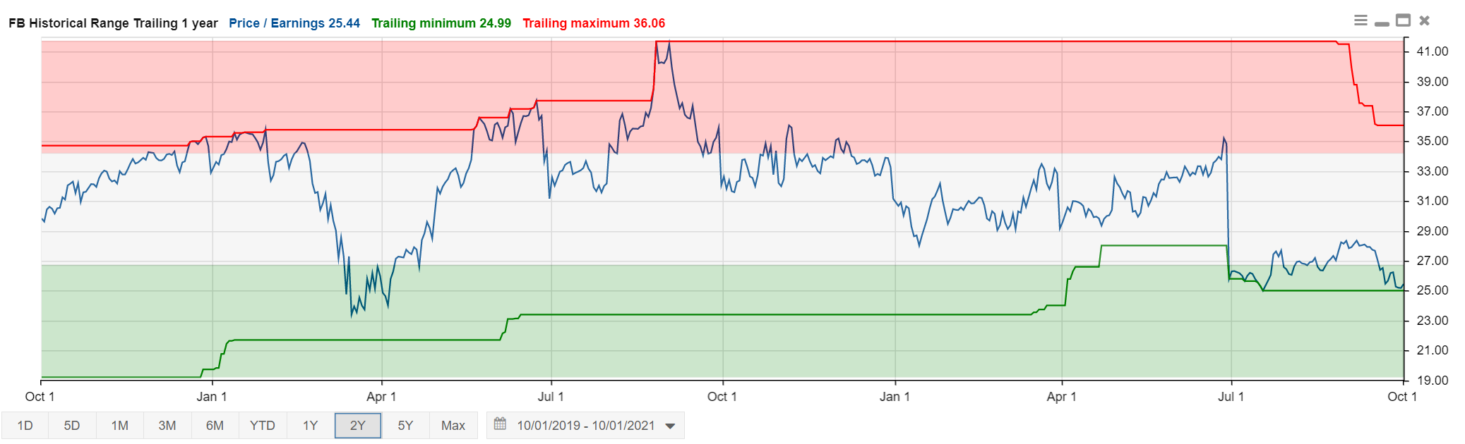 The example below shows Facebook’s (FB) Price to Earnings ratio over the last two years compared to the P/E range over the trailing one year period. Here you can see that Facebook has gone from being at the very high part of its range a year ago to the low part of its range now. Or in other words, it’s currently relatively inexpensive compared to historical valuations.