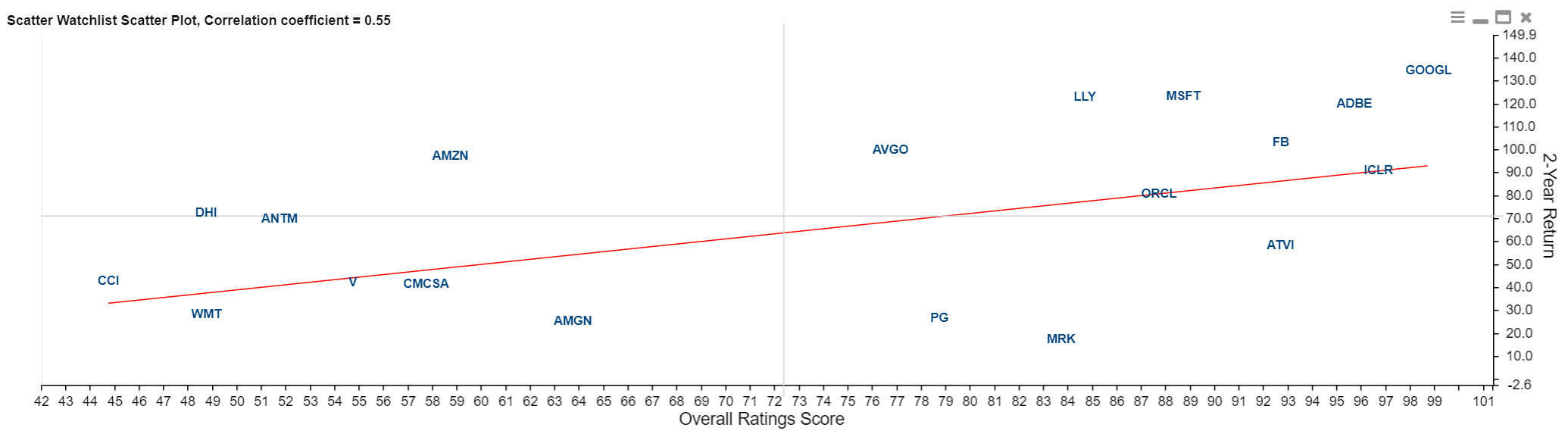 The example below show the stocks from a Watchlist plotted with the Stock Rover Overall Rating on the X-axis and the two year total return, including dividends, on the Y-axis. Here you can see a reasonably strong positive correlation between the Stock Rover Rating and two year returns.