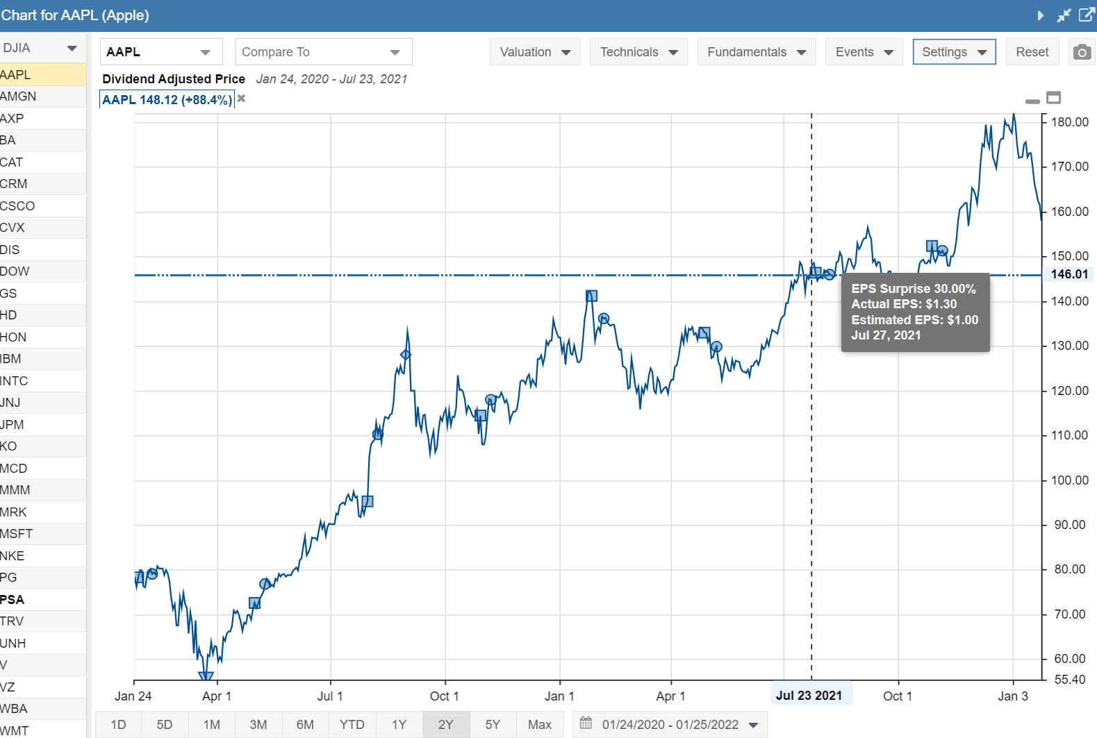 When a company reports quarterly earnings these chart annotations show how much the preliminary results beat or miss the consensus analyst expectations. The EPS surprise event often explains a sharp drop or bump in a stock price relative to the market.