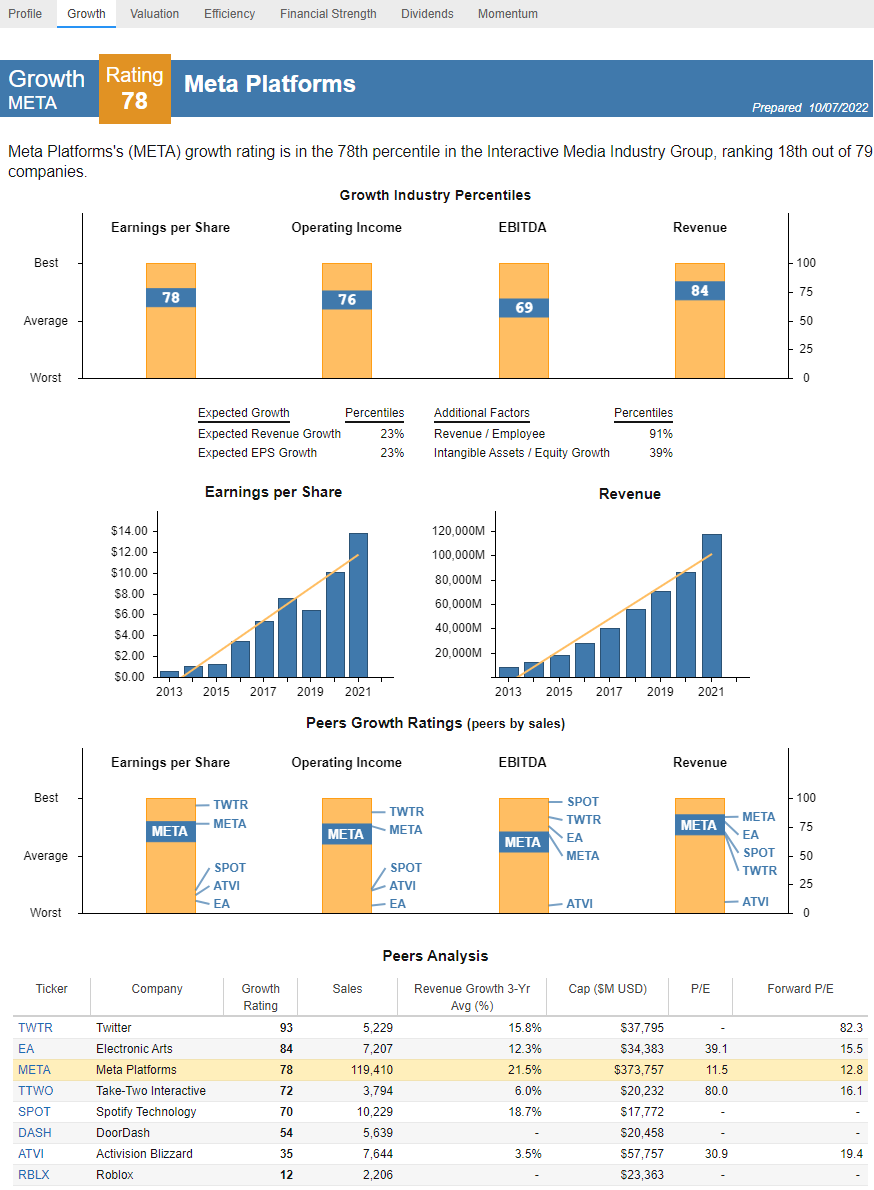 Our unique Stock Ratings facility distills complex historical data into percentile performance grades for stocks vs. their peers in key areas such as growth, valuation, efficiency, financial strength, quality, dividends and momentum. An overall grade is rendered for each stock, making it easy to evaluate and compare different investment opportunities.