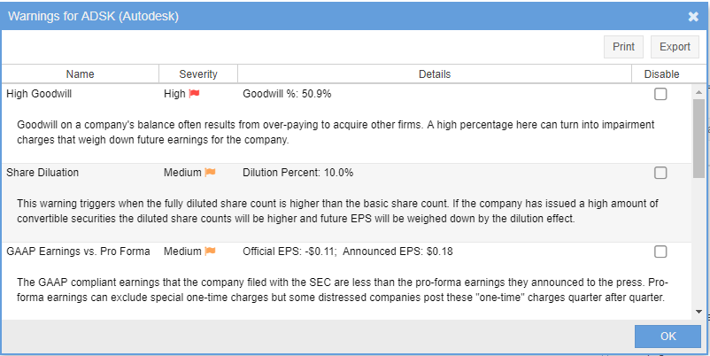Like most of Stock Rover, warnings are customizable so you can focus on just those that are meaningful to you.