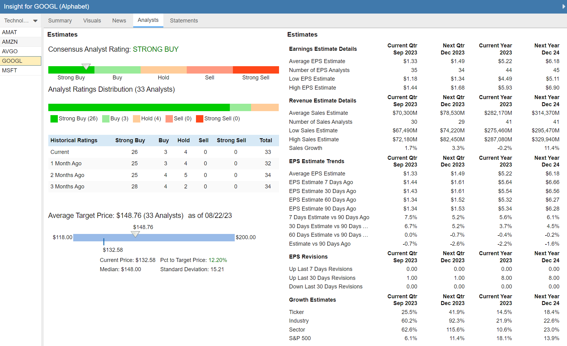 The analyst page provides a comprehensive view that analysts have towards a given stock including buy rating, price targets, earnings estimates and revisions and the level of dispersion of analyst estimates.