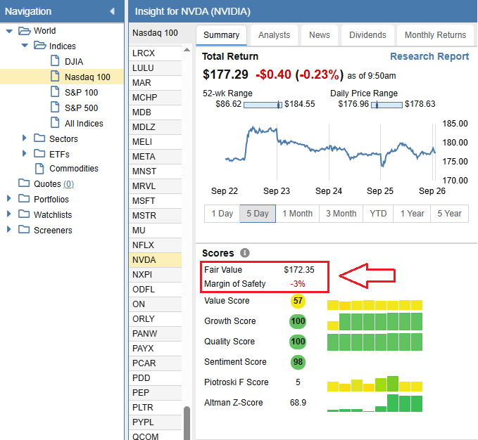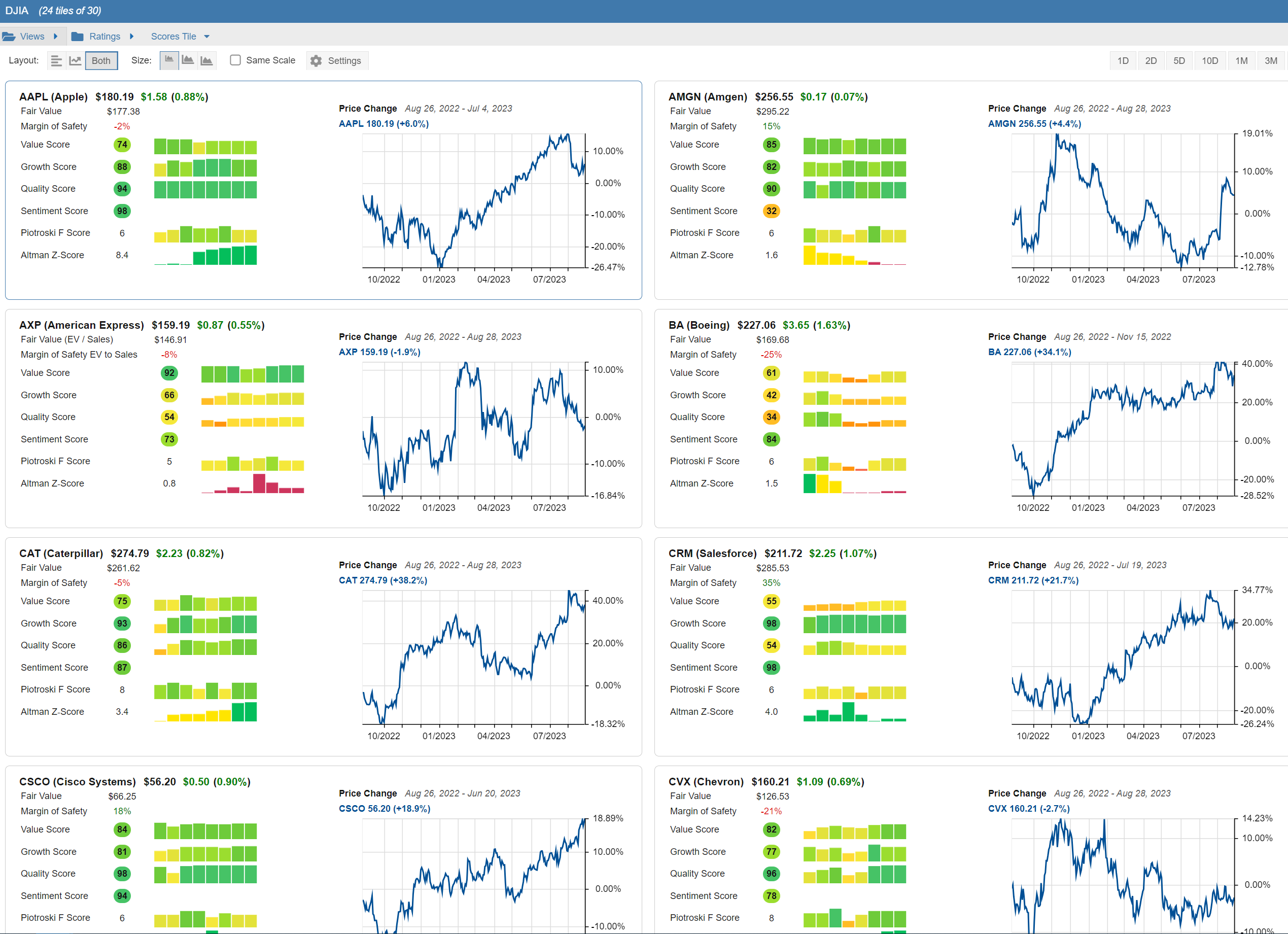 An example of tickers from the Dow 30 being compared by their scores, fair value and margin of safety