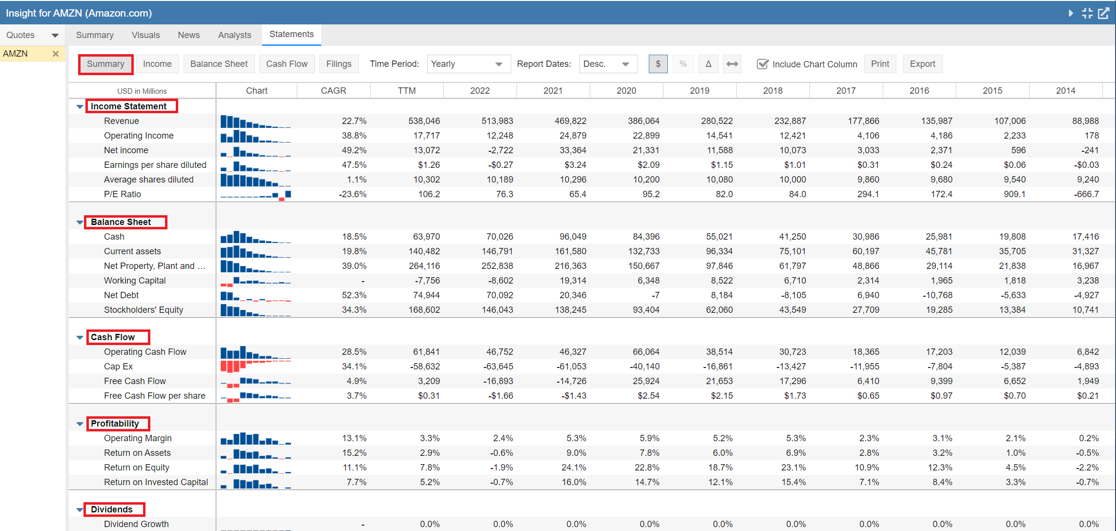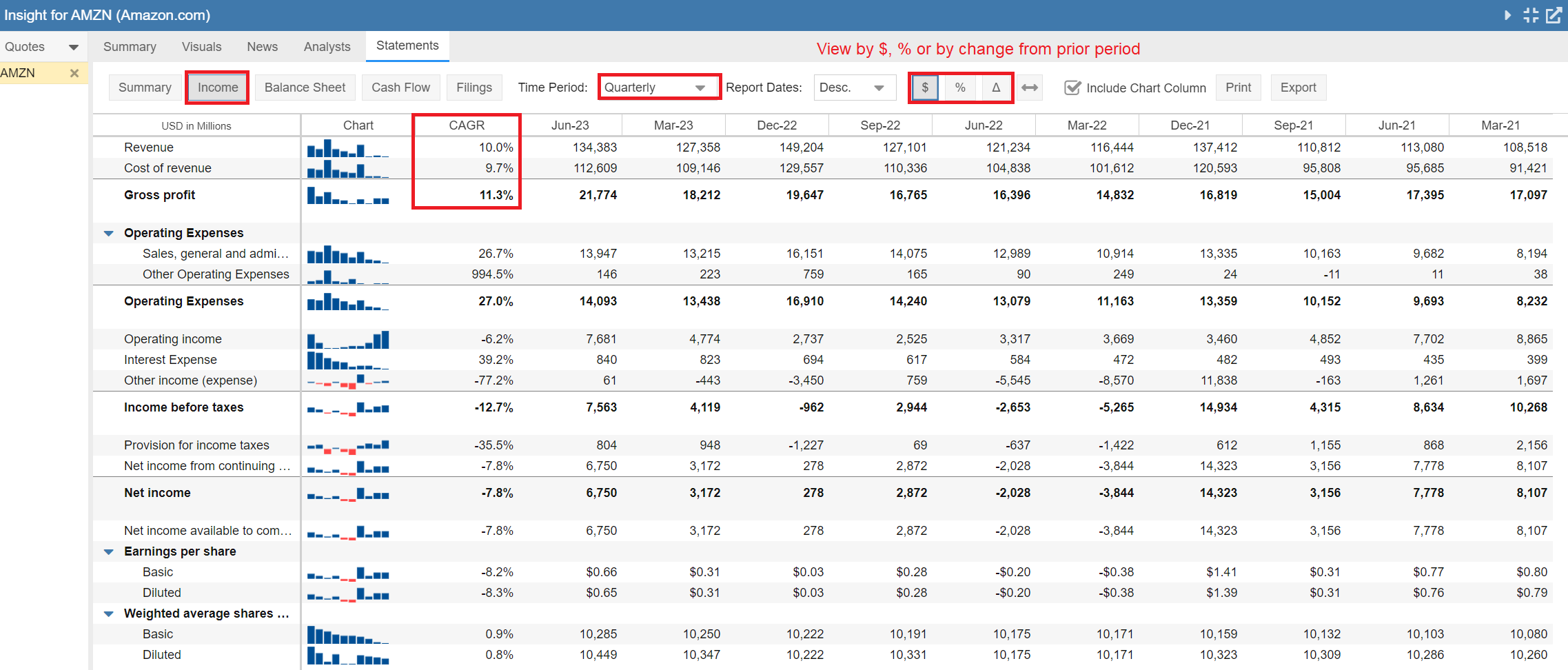 With Stock Rover You can compare a company’s year vs. year or quarter vs. quarter performance across ten years of data. You can also see all statements on a percentage basis or on a percentage change from the prior period basis. We even include a CAGR column to show the compound annualized growth rate of each statement item. These features make it very easy to see a company’s performance over time on an apples vs. apples basis, especially when looking at companies with seasonal business, like Amazon or Macy’s.