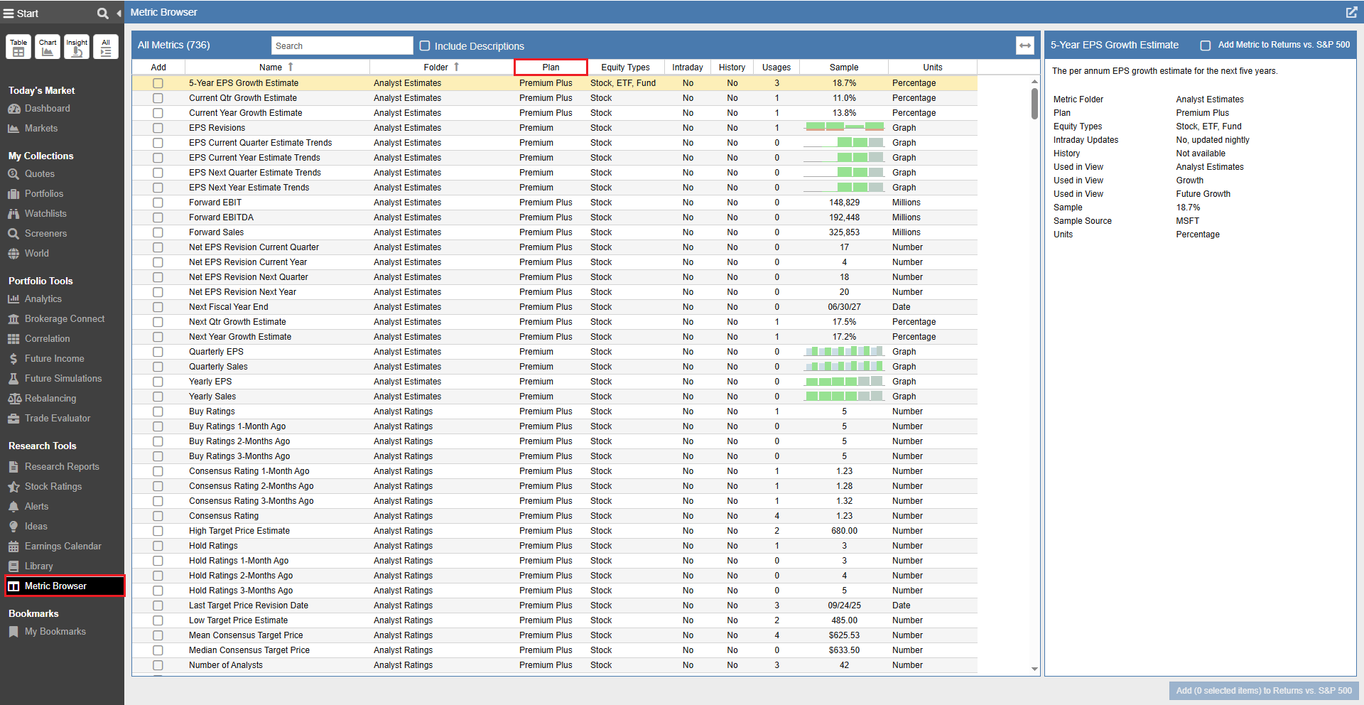 Stock Rover comes with a built in Metrics Browser to make it dead easy to browse, find and add metrics of interest to your Stock Rover data views.