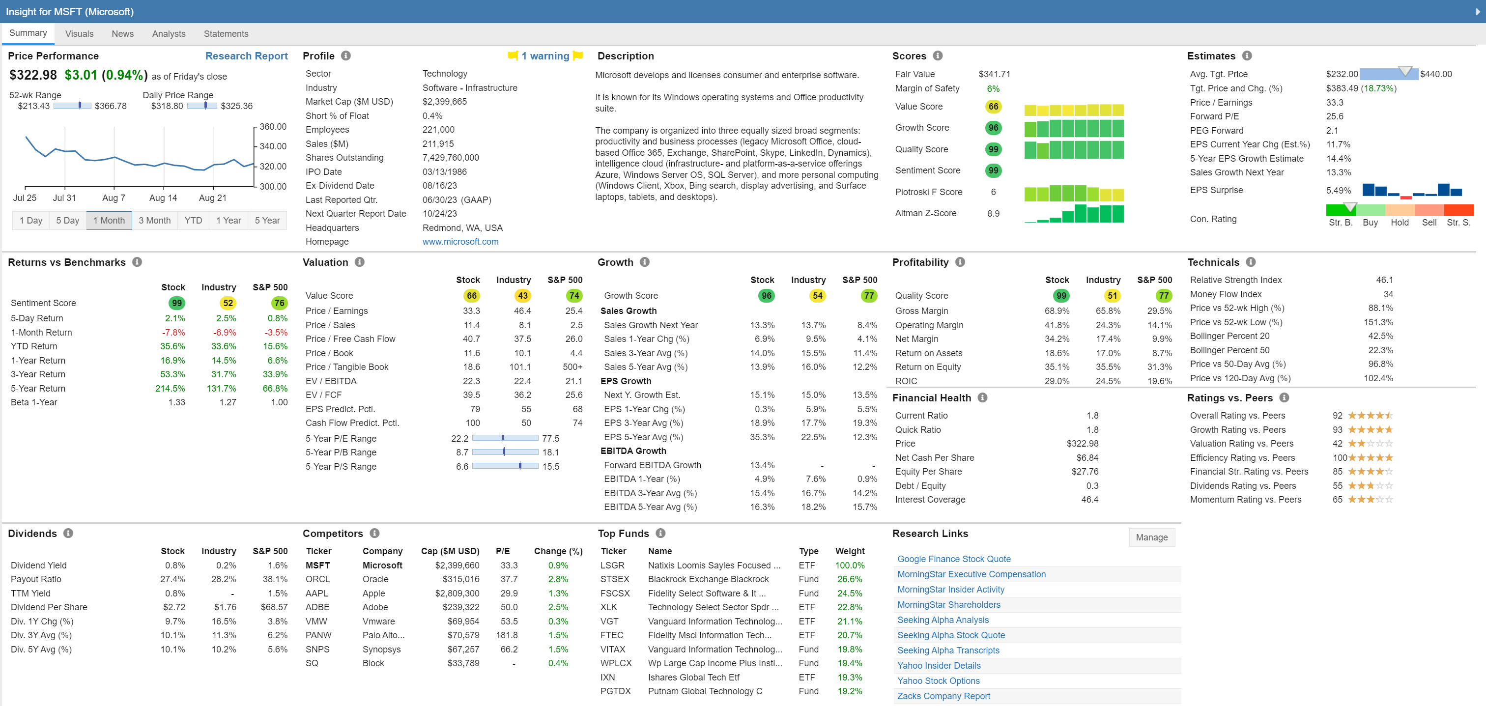 Stock Rover computes the fair value and margin of safety for all stocks in its universe. Stock Rover also computes a number of scores that rank stocks vs. their peers and the overall market. These scores include valuation, growth, profitability, capital efficiency, financial strength, quality, sentiment, momentum, the Piotroski F-Score and the Altman Z-Score. With these scores in hand it is easy to distinguish the performers from the non-performers in many different dimensions of investment performance.