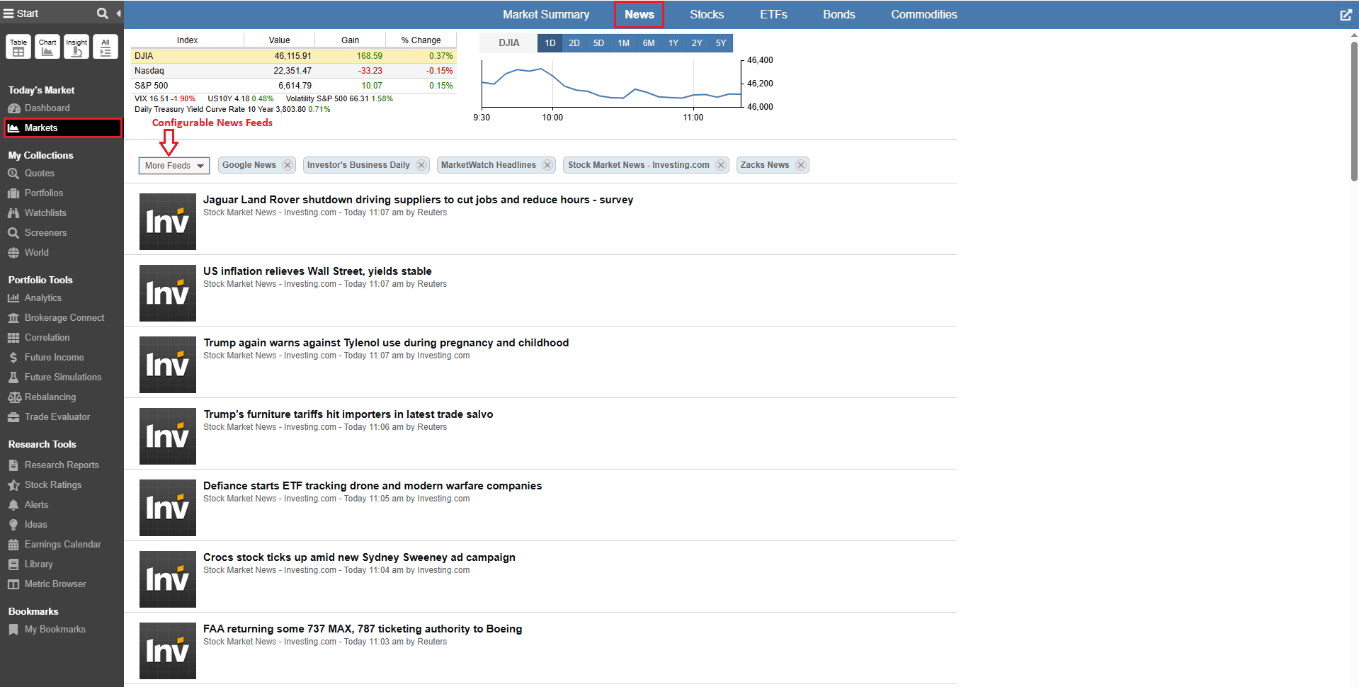 Get comprehensive market and company news from a variety of user configurable news sources.
