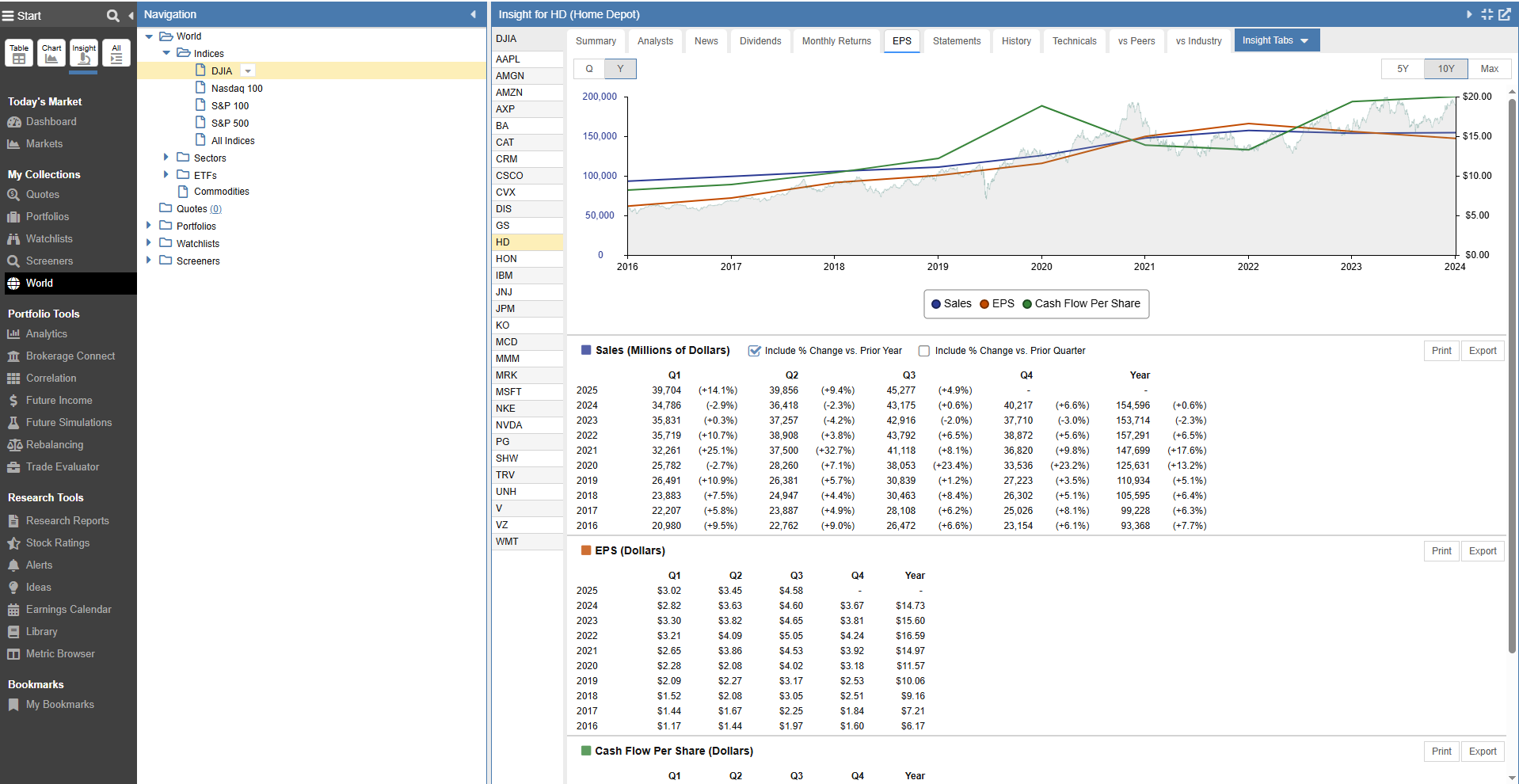 Stock Rover provides comprehensive data in an easy to digest and pleasing display. For example, the EPS tab provides details on how Sales, Earnings Per Share and Cash Flow have changed over time.