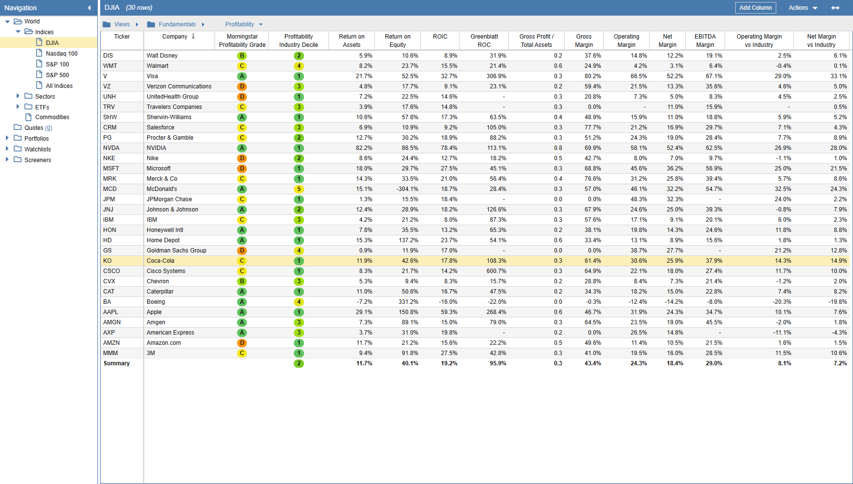 Add tickers one-by-one, or by loading datasets such as your portfolios or the DJIA. You can then compare these rows across hundreds of financial columns, which are organized into “views” such as Growth, Valuation, Momentum, Dividends, and Historical Returns. Create new views using any columns you like, or update existing views by adding, removing, or reordering columns.