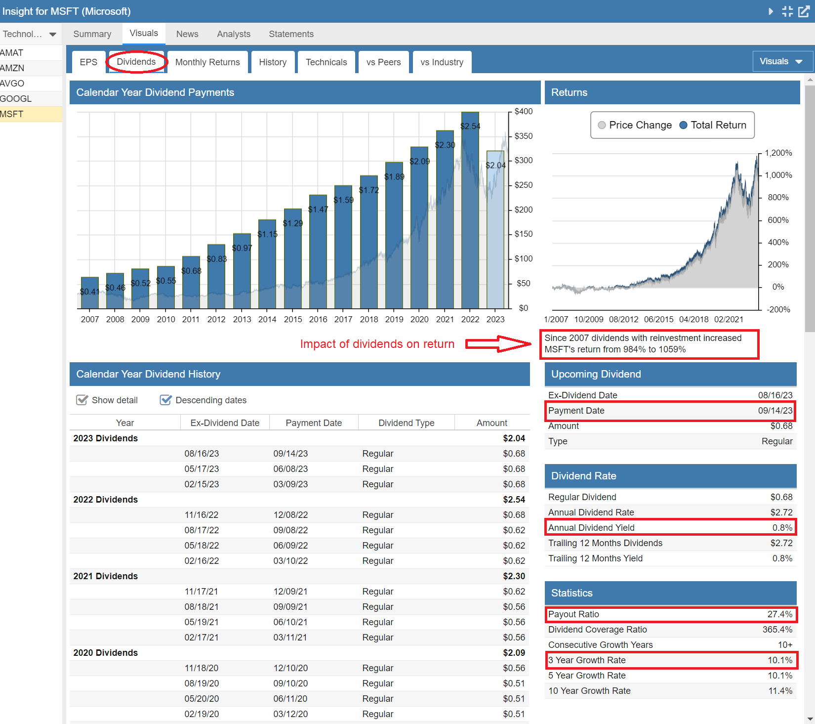 The dividend display in the Insight Panel is a great way to analyze the dividend performance of a stock, ETF or fund. The dividend display provides detailed metrics on yield, safety, coverage and growth of the dividend over time. You can also see all past and upcoming dividend payment information.