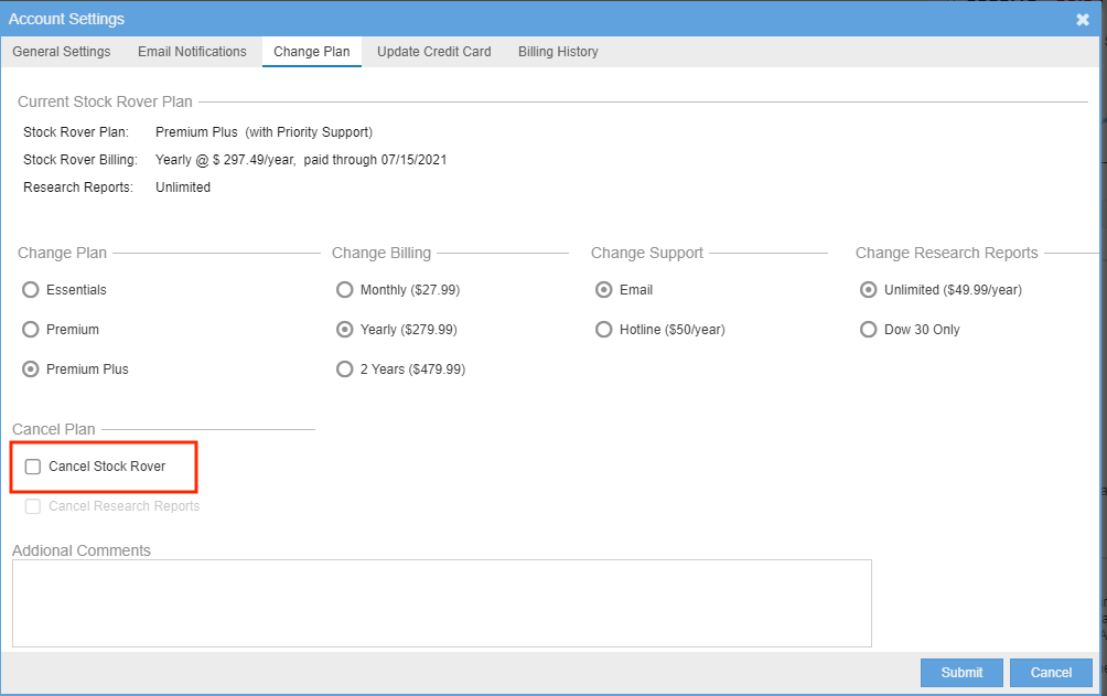 If you have a Research Reports subscription, which is a separate subscription, and wish to cancel that as well, be sure to also check the Cancel Research Reports box, which is below the Cancel Stock Rover box.